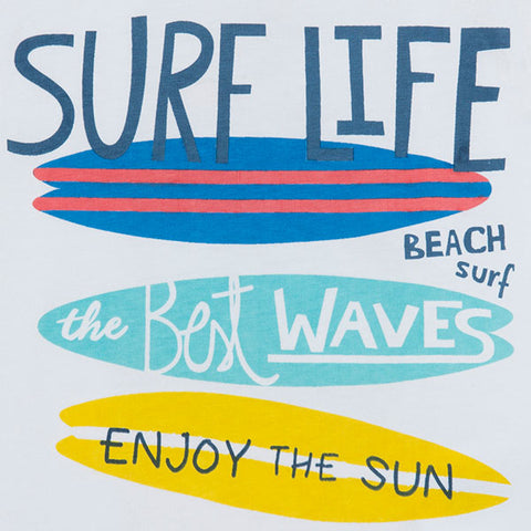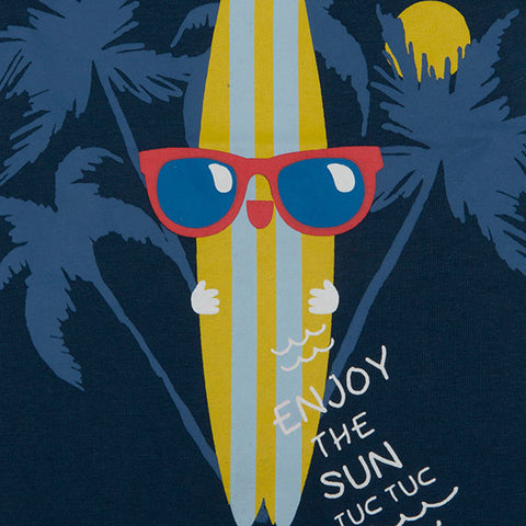 Complet trois pièces de la Ligne Vêtements Enfant tuc Tuc, collection Enjoy the Sun, composée d'un short uni et de deux t-shirts avec des imprimés colorés sur le devant.