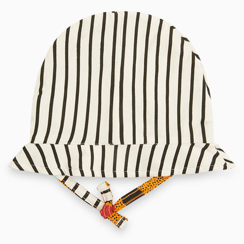 Casquette de la ligne de vêtements pour fille Tuc Tuc, avec des liens sous le menton et un motif à rayures, avec une application colorée à l'avant.