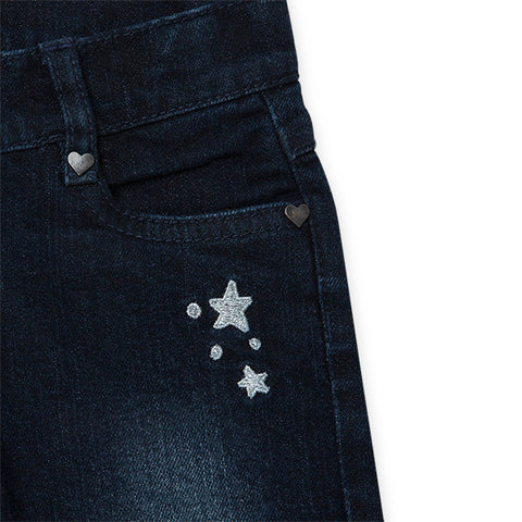 Pantalon en jean de la ligne vêtements fille Tuc Tuc, collection Glaciar, avec broderies sur le devant et taille réglable à la taille.