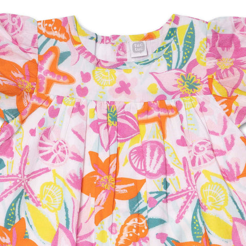 Abitino della Linea Abbigliamento Bambina Tuc Tuc, modello largo tagliato sul torace. Fantasia con soggetto marino in colori fluo.