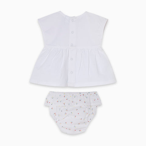 Ensemble deux pièces de la Ligne Vêtements Fille Tuc Tuc composé d'un shorty à motif avec élastique à la taille et d'un t-shirt sans manches boutonné dans le dos.