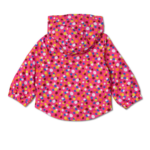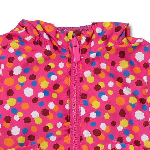Veste coupe-vent de la Ligne Vêtements Fille Tuc Tuc, avec motif à pois colorés sur fond fuchsia. Capuche, fermeture éclair et filet à l'intérieur.