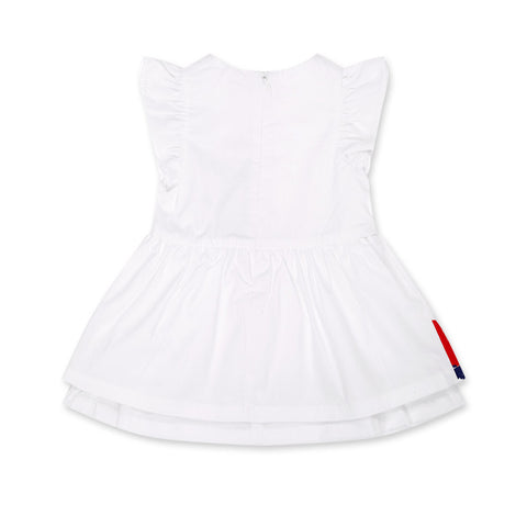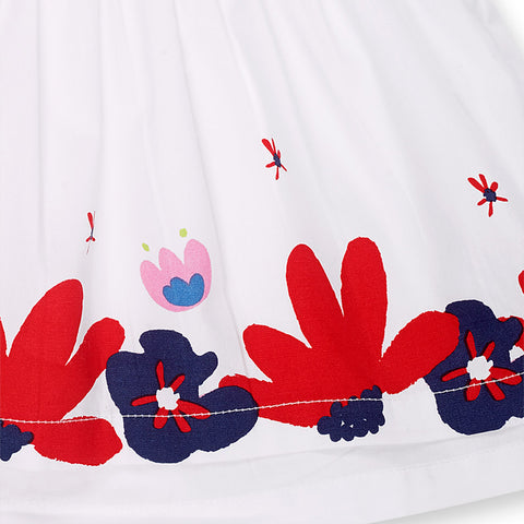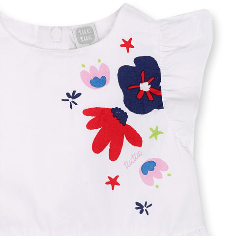 Robe en popeline de la Ligne Vêtements fille tuc Tuc, avec jupe ample et petits volants sur les bretelles. Imprimés colorés sur le devant et en bas.