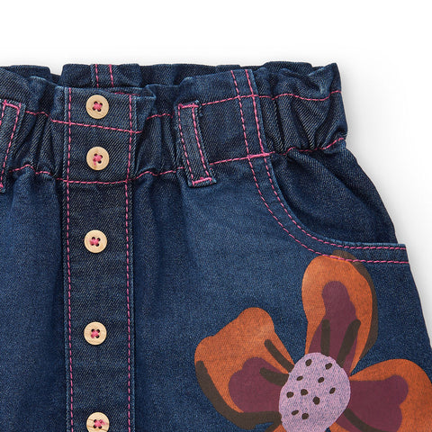 Jupe en jean de la Ligne Vêtements Fille Tuc Tuc, avec des boutons à l'avant et des imprimés de fleurs sur les côtés.