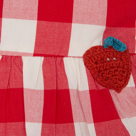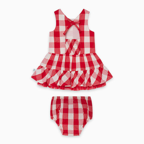 Vestitino de la Ligne Vêtements Fille Tuc Tuc avec une large jupe à volants et un motif à carreaux rouges. Culotte coordonnée jusqu'à 24 mois.