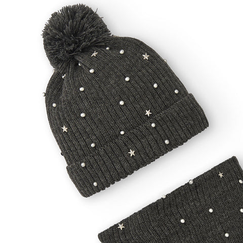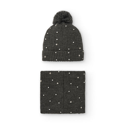 Set de la ligne Vêtements Fille Tuc Tuc, composé d'un bonnet avec pompon et d'un tour de cou avec applications métalliques.