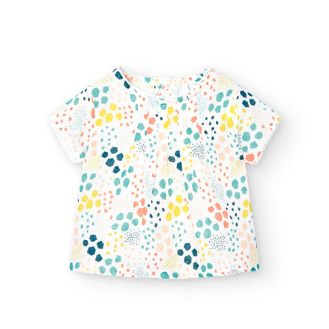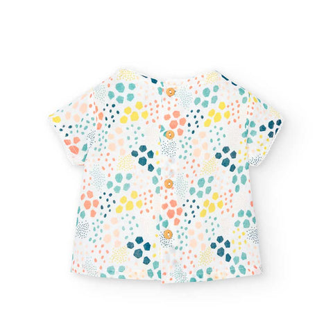 Ensemble deux pièces de la Ligne Vêtements Fille Boboli, avec culotte et blouse à manches courtes avec motif aux couleurs douces.