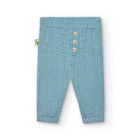 Ensemble deux pièces de la Ligne Vêtements Enfant Boboli, avec pantalon à entrejambe bas et motif à carreaux ; t-shirt à manches longues avec boutons-pression sur l'épaule et impression colorée sur le devant.