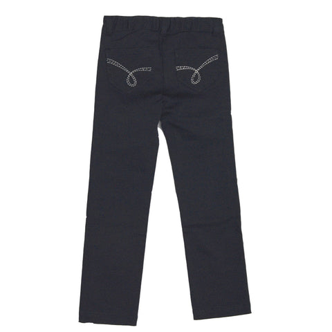 Pantalon en satin de la ligne de vêtements pour fille Mirtillo. Modèle uni à cinq poches. Petites poches à l'arrière avec broderie argentée. Taille réglable à l'intérieur.