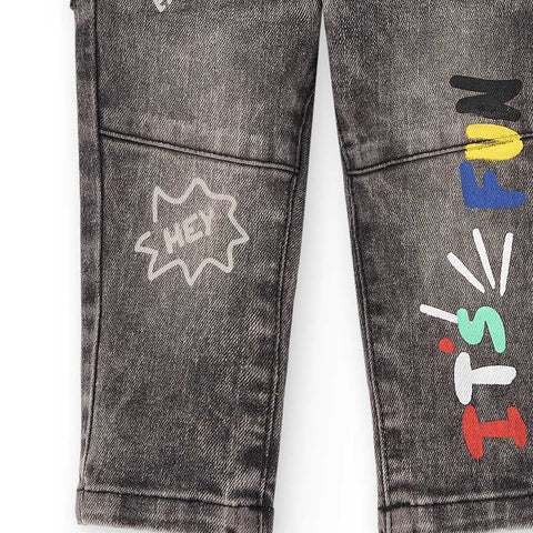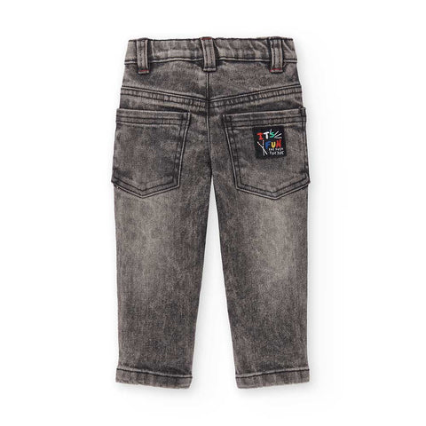 Pantalon en jean de la Ligne Vêtements Enfant Tuc Tuc, avec taille réglable à la taille et petites impressions à l'avant.