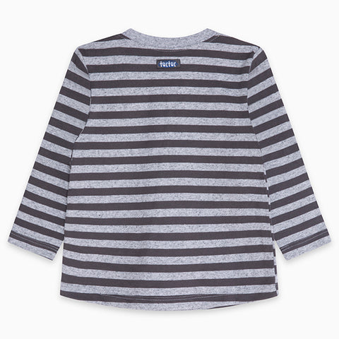 T-shirt de la Ligne Vêtements Enfant Tuc Tuc, avec motif à rayures et petits boutons sur les épaules et devant des dessins colorés.