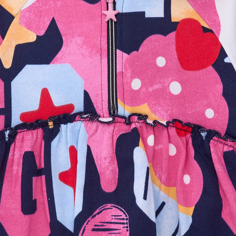 Abitino de la Ligne Vêtements Fille Tuc Tuc, en molleton avec capuche, jupe ample et motif multicolore intégral.
