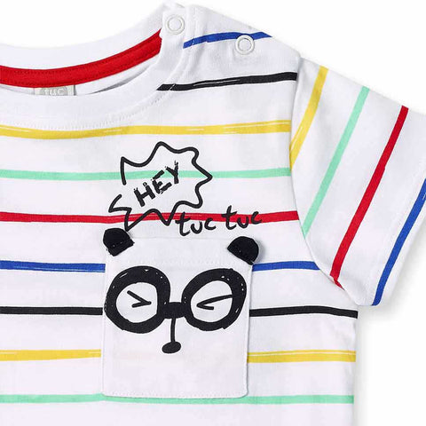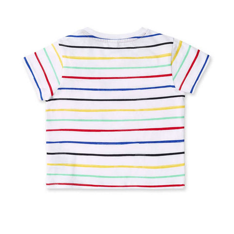 T-shirt from the Tuc Tuc Children's Clothing Line, featuring a multicolor striped pattern and a front pocket.