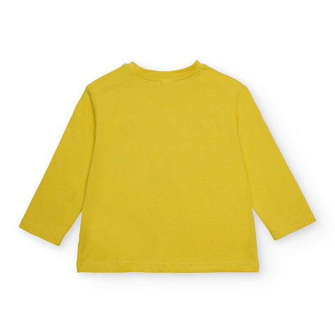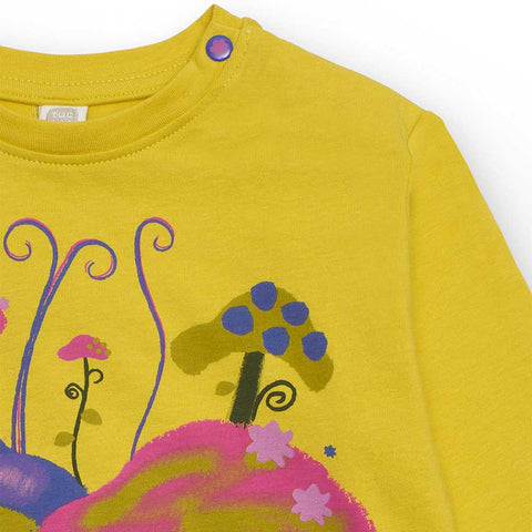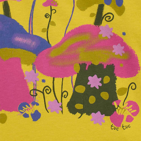 T-shirt from the Bmabina Tuc Tuc Clothing Line, with a round neck and colorful prints on the front on a mustard background.