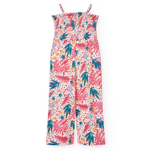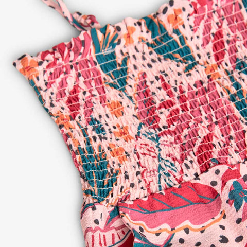 Long dress from the Boboli Girls' Clothing Line, in crepe fabric, with tropical pattern and elasticated top.