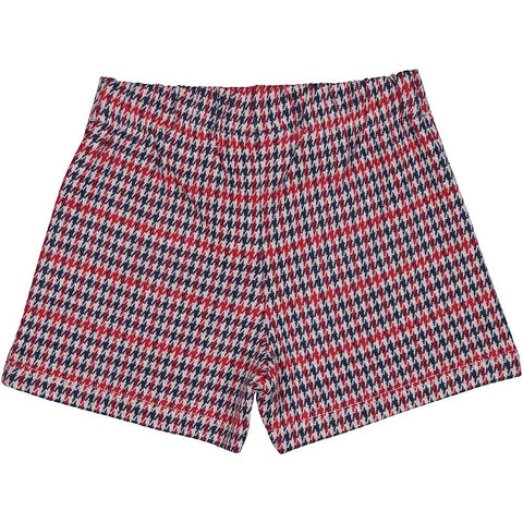 Shorts from the Birba Girls' Clothing Line in blue and red houndstooth, with a bow on the front and a faux skirt design.