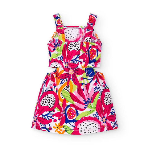 Abitino in popeline della Linea Abbigliamento Bambina Tuc Tuc, con spalline elastiche, modello con elastico in vita e fori sui lati. Fantasia multicolor all-over.