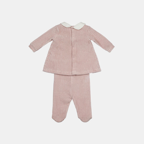 Completo in ciniglia della Linea Abbigliamento Bambina Lalalù, a coste larghe, con colletto in tessuto. e applicazione di rosellina sul davanti.