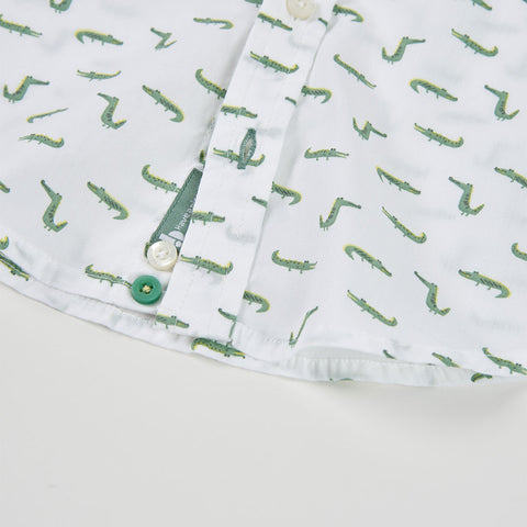 Camicia della Linea Abbigliamento Bambino Boboli, con stampa di coccodrilli colorati all over e bottoncini sulle maniche per risvoltini.