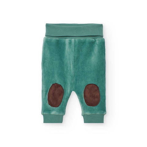 Completo due pezzi della Linea Abbigliamento Bambino Boboli, con pantalone in velluto rigato e maglioncino abbottonato sul dietro con taschina sul davanti e applicazione a forma di ghianda.