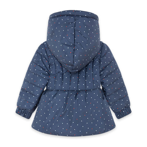 Piumino della linea abbigliamento bambina Tuc tuc, collezione Hello London, con cappuccio e interno in velluto. Fantasia a cuoricini e, sul davanti, due fiocchetti in tessuto,
