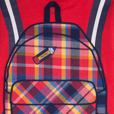 T-shirt della Linea Abbigliamento Bambino Tuc Tuc con bottoncini a pressione sulla spallina e sul ditro simpatico disegno di zainetto con ricami.