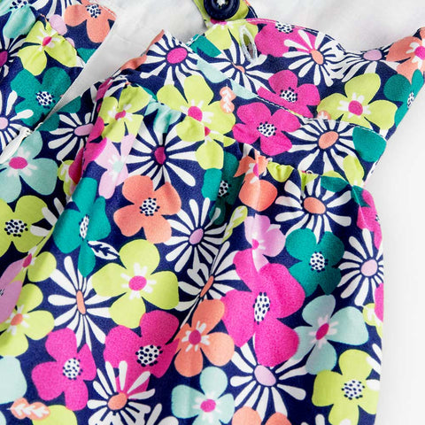 Abitino satin della Linea Abbigliamento Bambina Boboli, con fantasia floreale multicolor. bretelline incrociate dietro  e coulotte abbinata nelle taglie piccole.