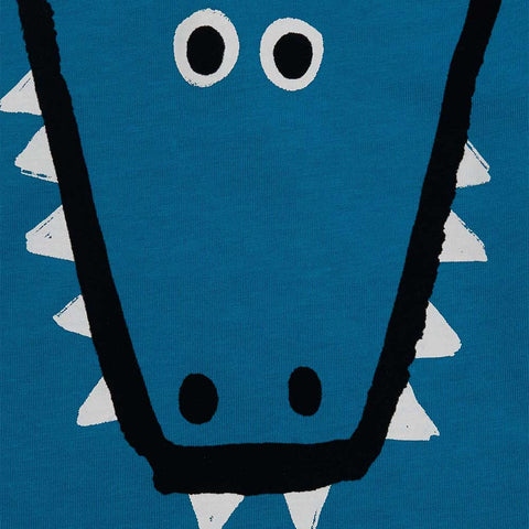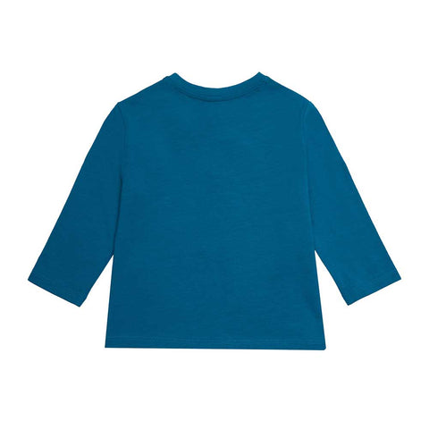 Maglietta della Linea Abbigliamento Bambino Tuc Tuc, con disegno di mostriciattolo sul davanti su fondo azzurro.