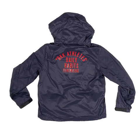 Giubbino della Linea Bambino Bikkembergs, a vento, con chiusura zip e cappuccio. All'interno retina e stampa sul dietro in contrasto di colore.