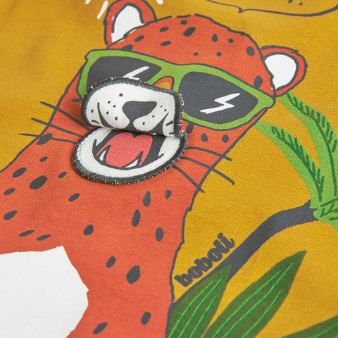 Maglietta della Linea Abbigliamento Bambino Boboli, con stampa colorata sul davanti e applicazione gioco in tessuto.