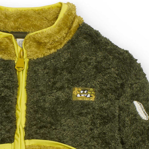 Giacca in pelliccia della Linea Abbigliamento Bambino Tuc Tuc, con chiusura zip, tasche sul davanti e mostro ricamato sulla schiena.