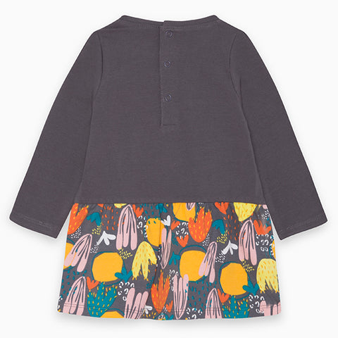 Vestitino della Linea Abbigliamento Bambina Tuc tuc in felpa, con bottoncini a pressione sul dietro; parte inferiore in fantasia multicolor e parte superiore a tinta unita con stampa sul davanti.