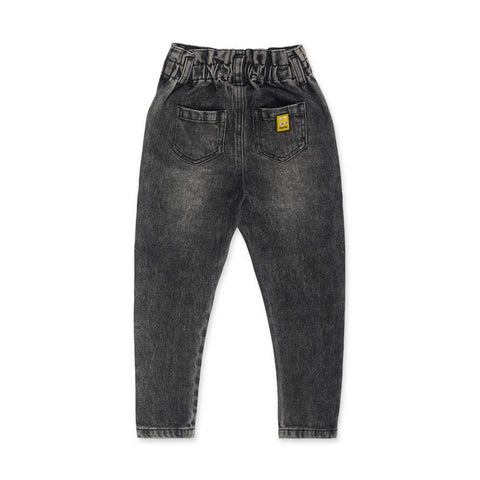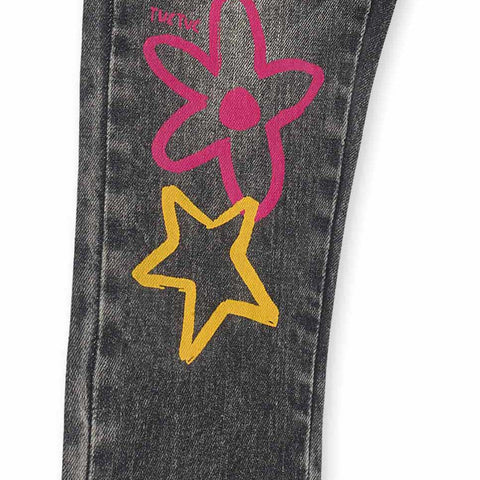 Pantalone jeans della Linea Abbigliamento Bambina Tuc Tuc, con elastico e misura regolabile in vita. sul davanti disegni a tinte fluo.