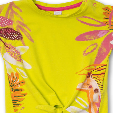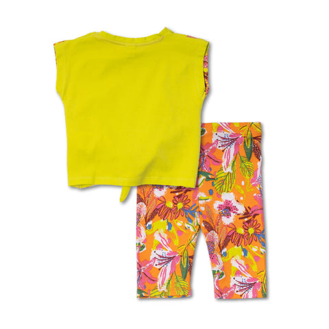 Completo due pezzi della Linea Abbigliamento Bambina Tuc Tuc, con t-shirt in colori fluo e stampe in contrasto, leggins a fantasia multicolor.