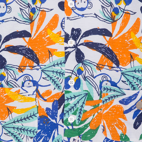 Tuta della Linea Abbigliamento Bambina Tuc Tuc in tessuto leggero, senza maniche e con taschine sul davanti. Bellissima fantasia tropicale all-over.