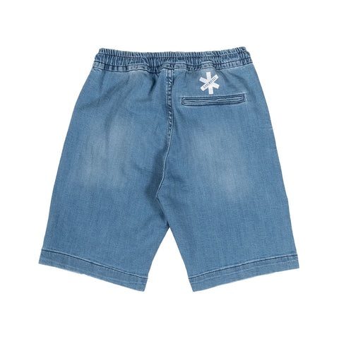 Bermuda denim della Linea Abbigliamento Bambino Bikkembergs, con tasche solo sul davanti e laccetti invita all'interno.