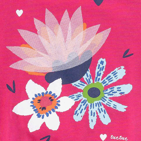 Abitino della Linea Abbigliamento Bambina Tuc Tuc, con manichine a sbuffo e stampa colorata sul davanti. Gonna ampia a fiori e nodino sul davanti.