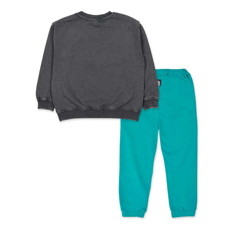 Completo due pezzi della Linea Abbigliamento Bambino Tuc Tuc, con pantalone modello tuta e felpa con stampa multicolor sul davanti.