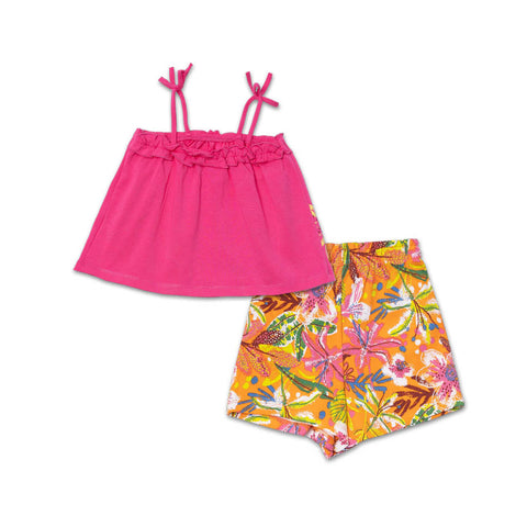 Completo mare due pezzi, della Linea Abbigliamento Bambina Tuc Tuc con top a bretelline con stampa colorata sul davanti , e pantaloncino a fantasia.