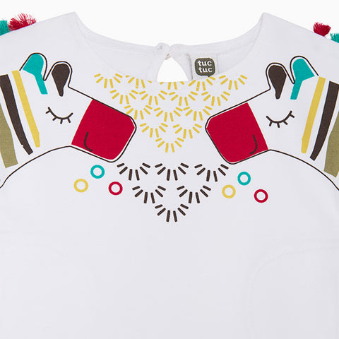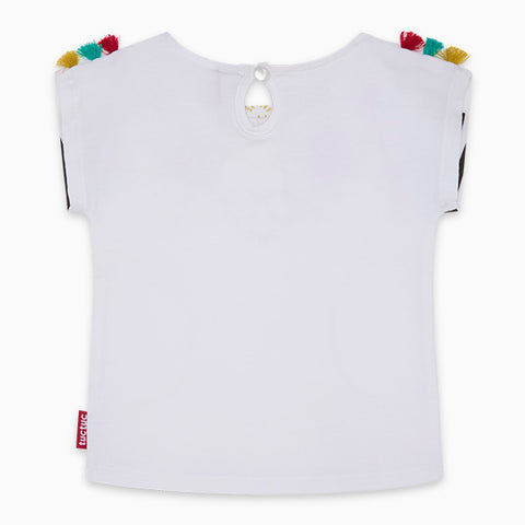 T-shirt della Linea Abbigliamento Bambina Tuc Tuc con pon pon sulle spalline e stampa colorata nella parte superiore.