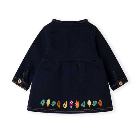Abitino in denim della Linea Abbigliamento Bambina tuc Tuc, con ricami colorati sul fondo e riccetto sul davanti con bottoncini in legno.
