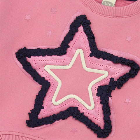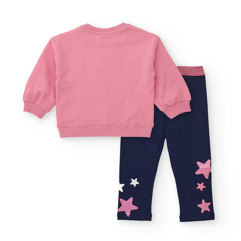 Completo due pezzi della Linea Abbigliamento Bambina tuc tuc, con felpa corta con stella al centro e leggins con stelline stampate.