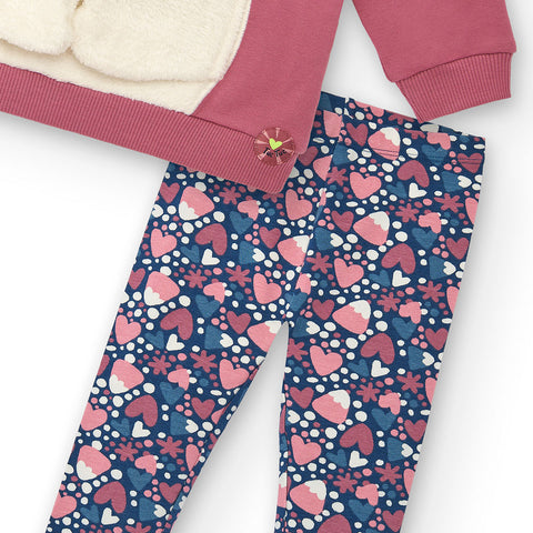 Completo due pezzi della Linea Abbigliamento Bambina Tuc TUc,composto da fellpa con applicazione di peluche sul davanti e leggins a fiori.