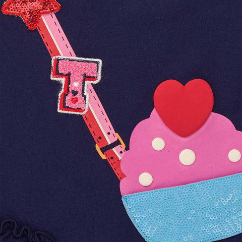 Completo due pezzi della Linea Abbigliamento Bambina Tuc Tuc, composto di leggins a fantasia multicolor e felpa con applicazioni e stampe sul davanti.
