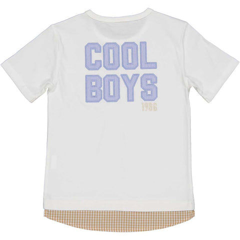 Maglietta della Linea Abbigliamento Bambino Trybeyond, con taschini sul davanti e fondo in tessuto a quadretti.