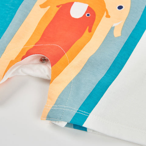 Pagliaccetto della Linea Abbigliamento Bambino Boboli, chiusura con bottoni a pressione e stampa nella parte bassa di elefanti multicolor.