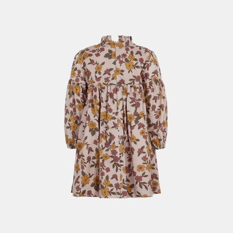 Abitino elegante della Linea Abbigliamento Bmabina Lalalù, in musola con colletto arricciato e fantasia a fiori su fondo rosa antico.
