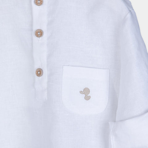 Chemise en lin à manches longues de la Ligne Vêtements Enfant Lalalù, avec col mao et petits boutons en bois.